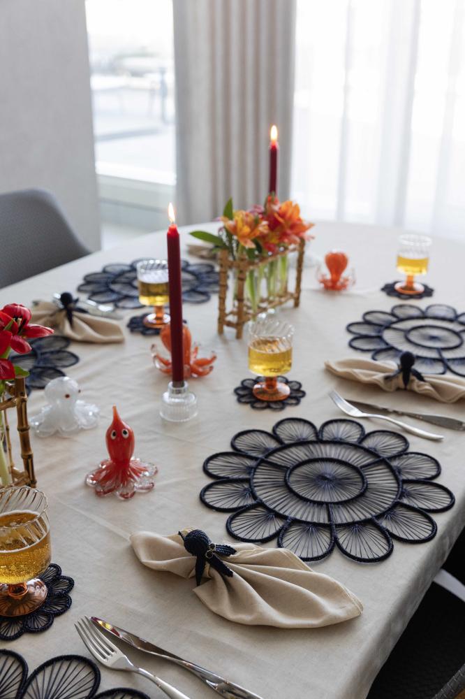 - توضع مفارش الطاولة بالأسفل وحلقات المنديل بالأعلى داخل البوكس بشكل جمالي .
