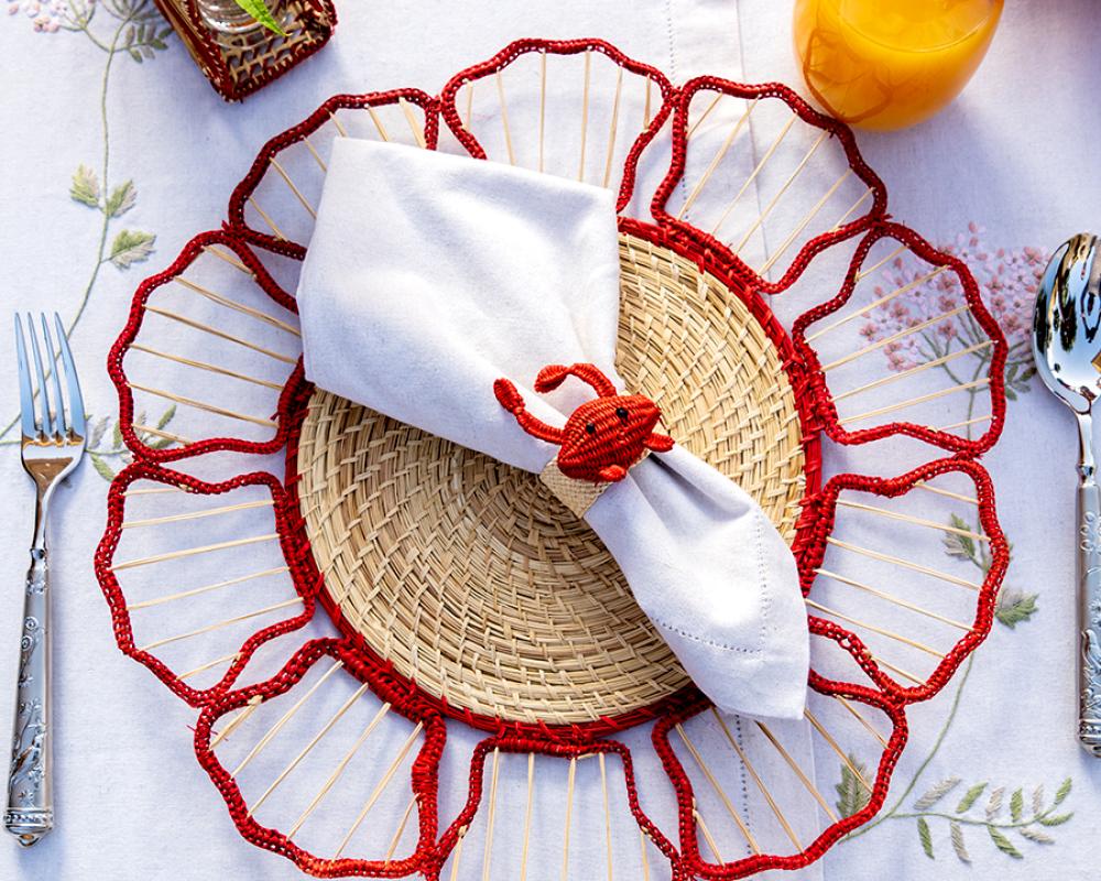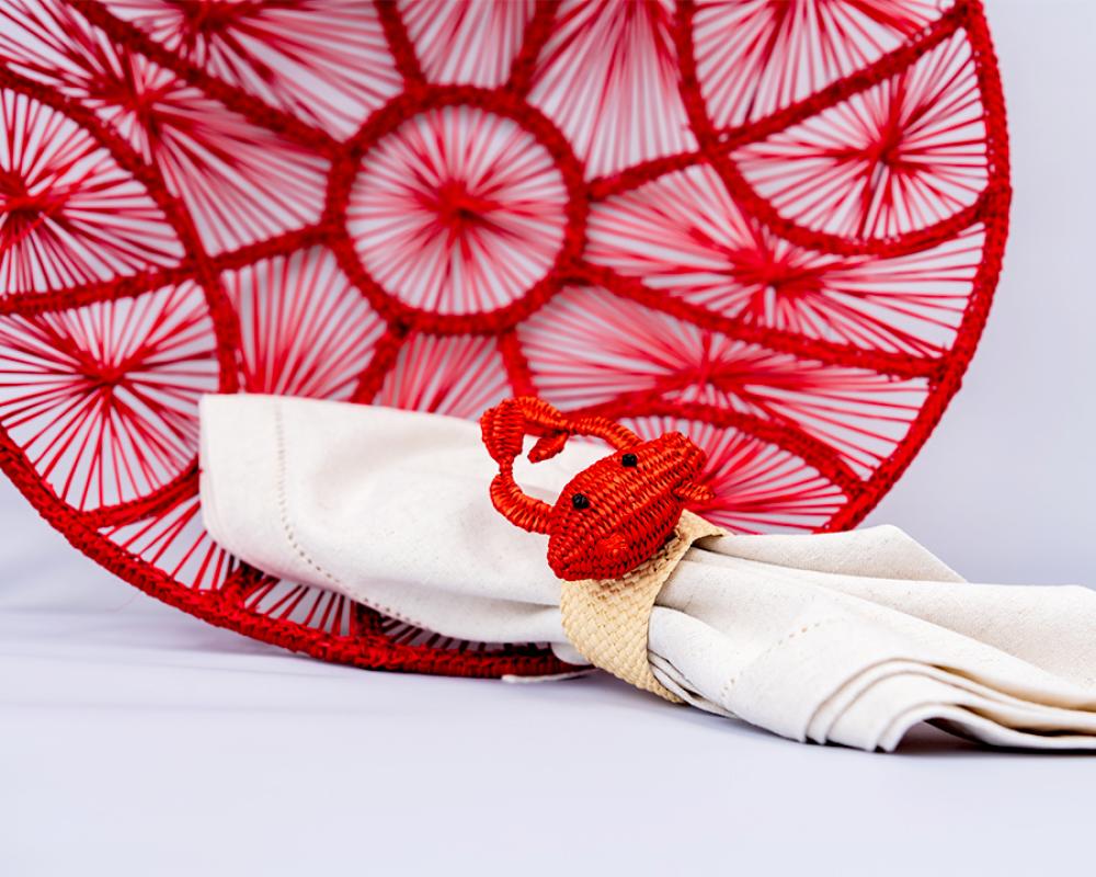 لا تكمل زينة طاولة الطعام الا بالتفاصيل الصغيرة، حلقات المناديل على شكل سلطعون بلون زاهي وشكل مميز وفريد، يتم تصنيع كل حلقة منديل على حده من ألياف طبيعية ١٠٠٪ المصبوغة والمنسوجة يدوياً على أيدي حرفيين مهره .
