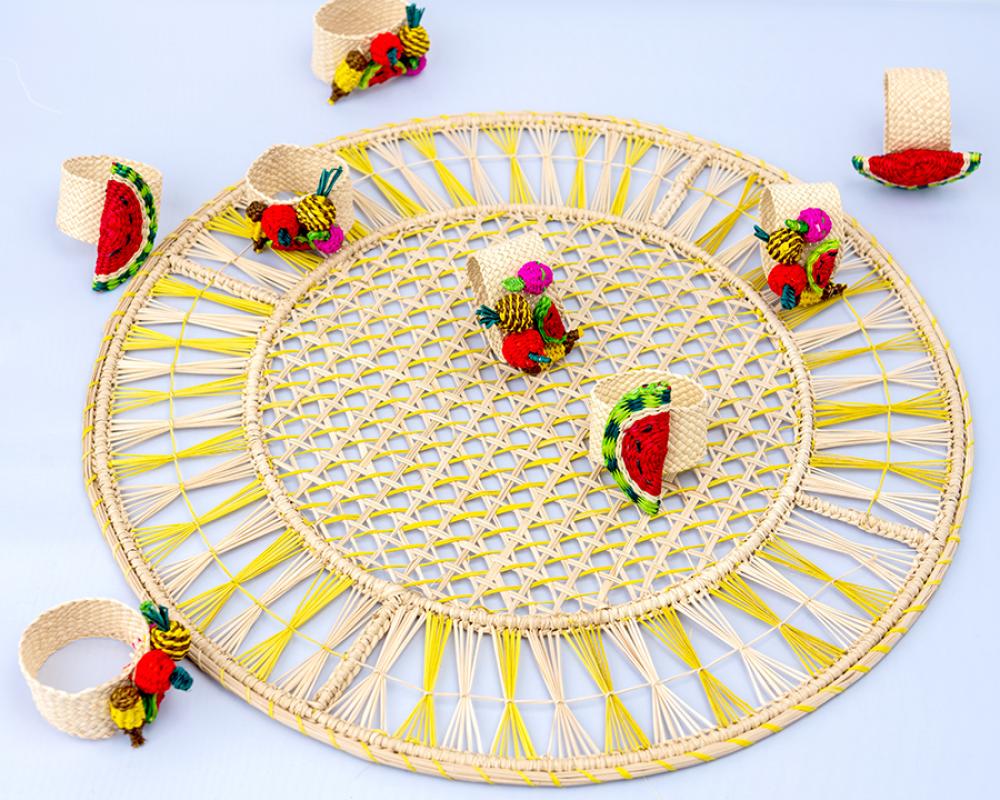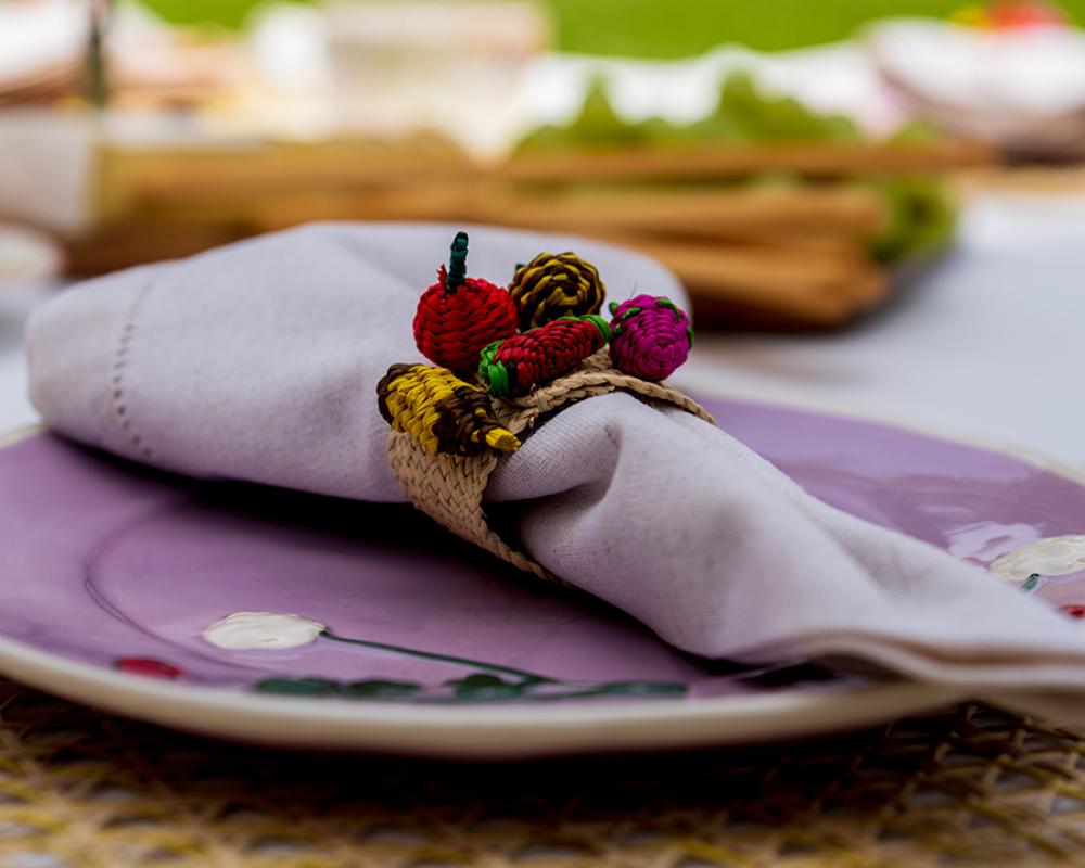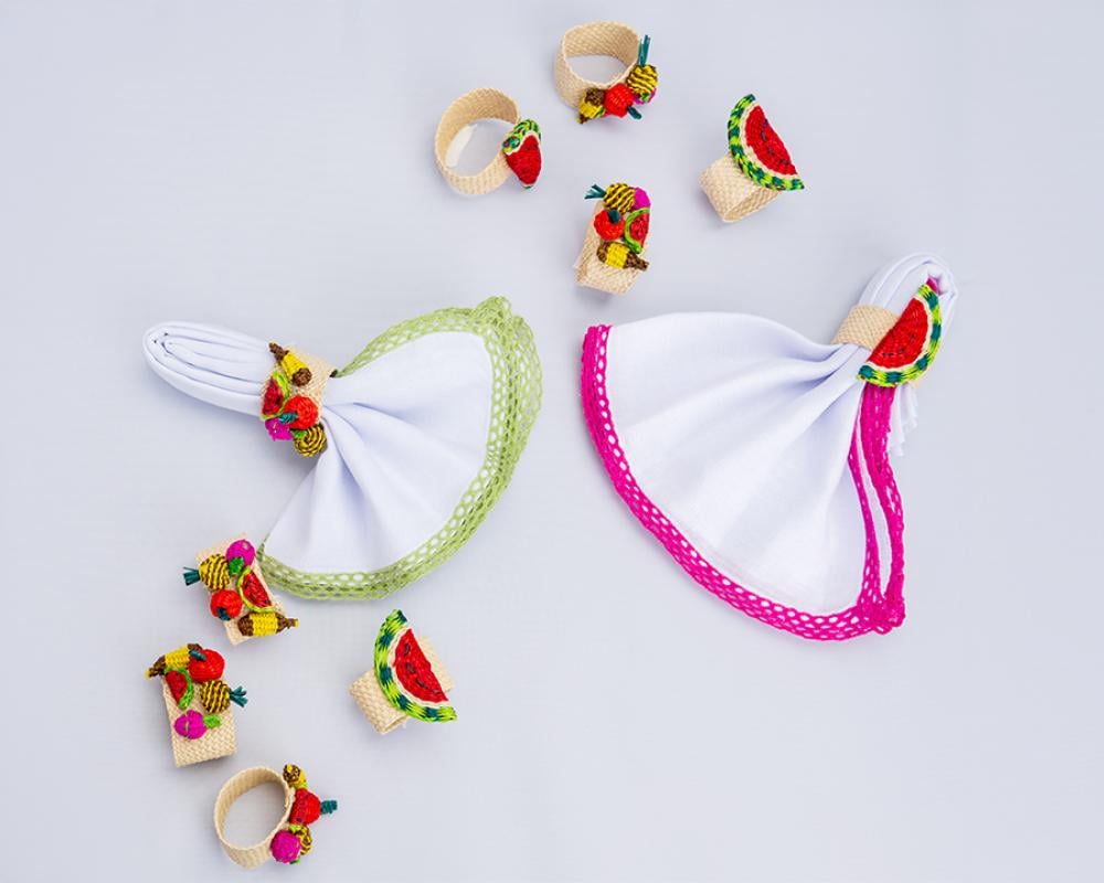لا تكمل زينة طاولة الطعام الا بالتفاصيل الصغيرة، حلقات المناديل على شكل فاكهة بألوان زاهية واشكال مميزه وفريدة، يتم تصنيع كل حلقة منديل على حده من ألياف طبيعية ١٠٠٪ المصبوغة والمنسوجة يدوياً على أيدي حرفيين مهره .